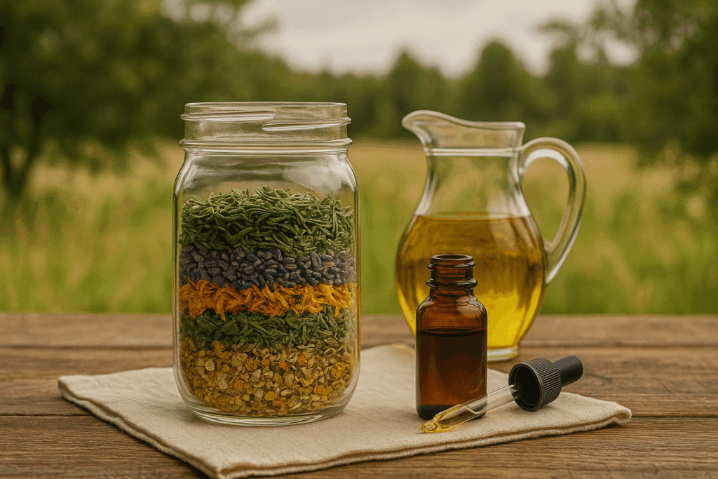 Tinturas: Son extractos líquidos concentrados obtenidos al macerar plantas secas o frescas en una base de alcohol (como etanol) durante un periodo prolongado. El alcohol actúa como solvente para extraer los principios activos de la planta. Las tinturas se usan principalmente en fitoterapia y medicina natural, no se aplican directamente sobre la piel sin dilución y no deben confundirse con los aceites (Newall et al., 1996).